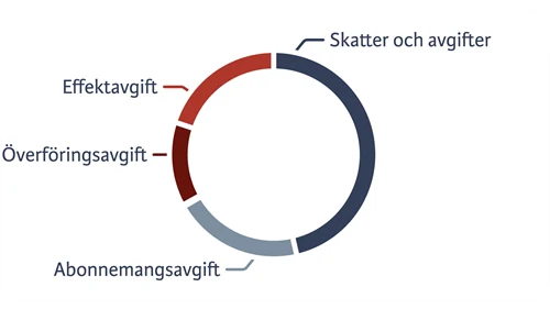 - Effektavgiften (kr/kW) och överföringsavgiften (öre/kWh) är olika på dag och natt.